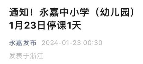 温州市教育局于1月23日凌晨在微信公众号上发布《关于全市中小学(幼儿园)停课的紧急通知》,其中提到,温州各地多条线路已因结冰实行道路临时封闭管理,为保障师生安全,经研究,决定温州各中小学(幼儿园)停课1天。
