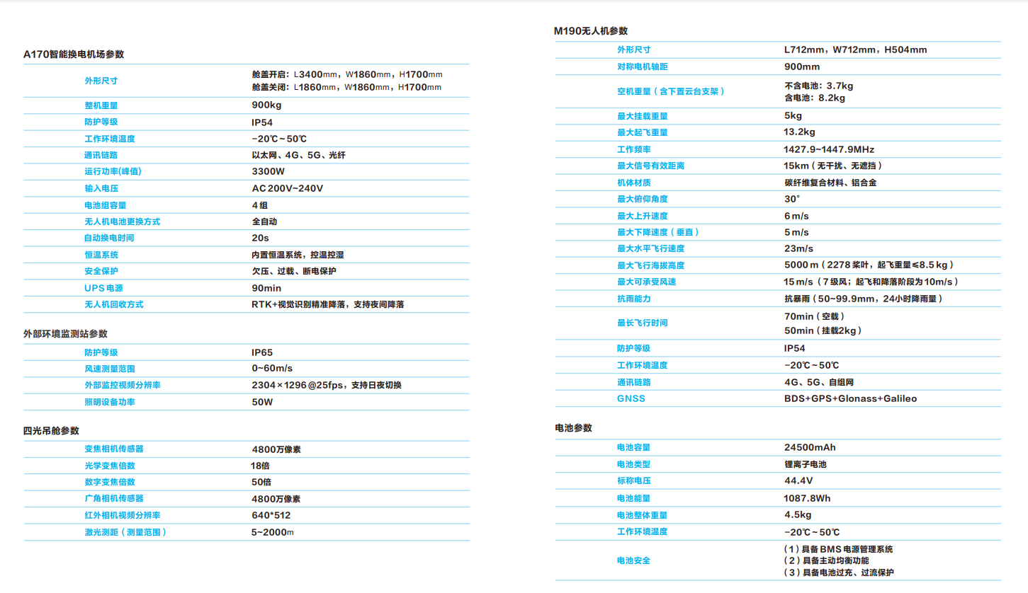 鼎信智慧PRO自动化巡检平台由A170智能换电机场与M190无人机+多类型负载组成,具有超强的 环境适应性,可轻松应对各种极端环境及高频次、多任务融合的应用场景,实现7×24h无人值守全自动 化作业。