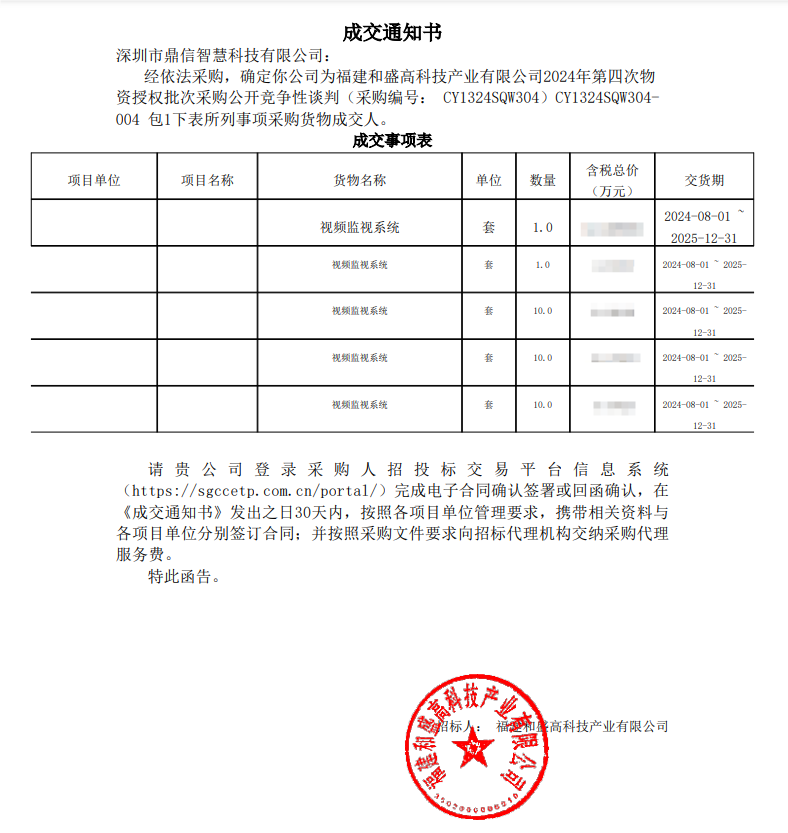 On July 22, 2024, Shenzhen Dingxin Intelligent Technology Co. Ltd successfully won the bidding for the fourth time of Fujian Hesheng Hi-Tech Industry Co. 2024 in this open tender procurement of material category. Material Authorized Batch Procurement Open Competitive Negotiation Procurement of Main EquipmentVideo Surveillance System< (Procurement Number: CY1324SQW304).