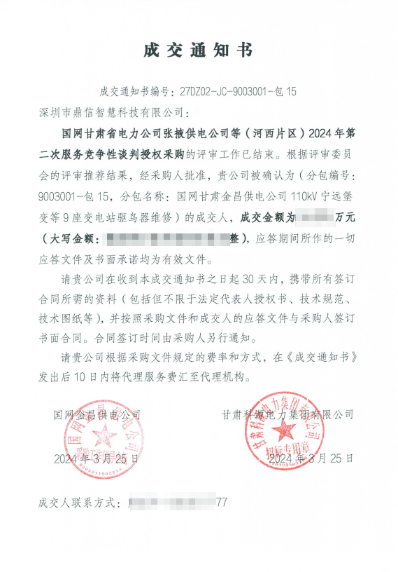 March 25, 2024,SHENZHEN DINSEE SMART TECHNOLOGY CO..LTD In this open tender procurement in the material category,Successfully won the State Grid Gansu Electric Power Company procurement of main equipment State Grid Gansu Jinchang Power Supply Company substation bird repeller maintenance (Notice of Completion No.: 27DZ02-JC-9003001-package 15) good results frequently spread.