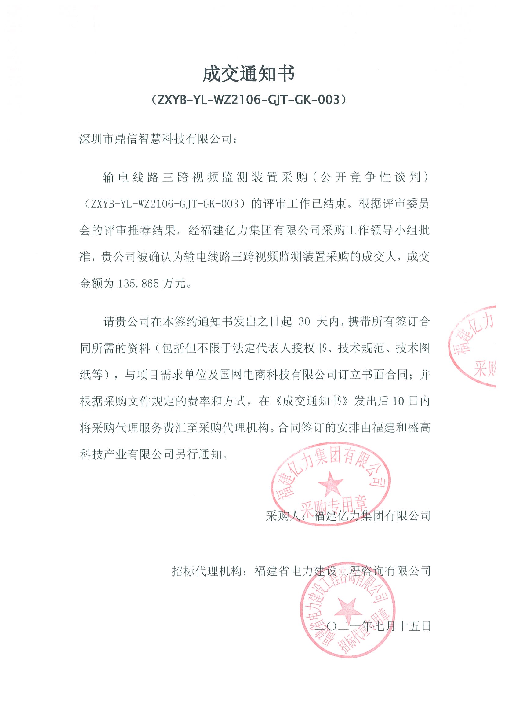 输电线路三跨视频监测装置采购(公开竞争性谈判) (ZXYB-YL-WZ2106-GJT-GK-003)的评审工作已结束。根据评审委员会的评审推荐结果,经福建亿力集团有限公司采购工作领导小组批准,我司深圳市鼎信智慧科技有限公司被确认为输电线路三跨视频监测装置采购的成交人,成交金额为135. 865万元。
