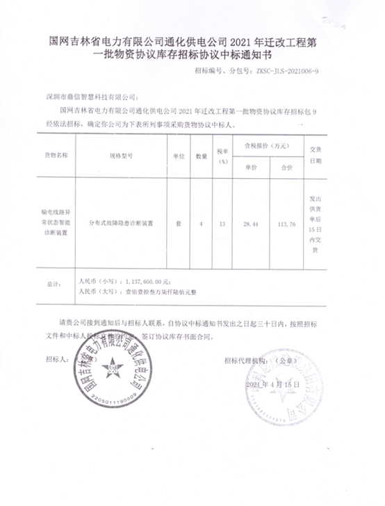 国网吉林省电力有限公司通化供电公司2021年迁改工程批物资协议库存招标包9(招标编号、分包号:ZKSC-JLS-2021006-9)经依法招标,确定深圳鼎信智慧科技科技有限公司中标输电线路异常状态智能诊断装置(规格型号:分布式故障隐患诊断装置)标包。