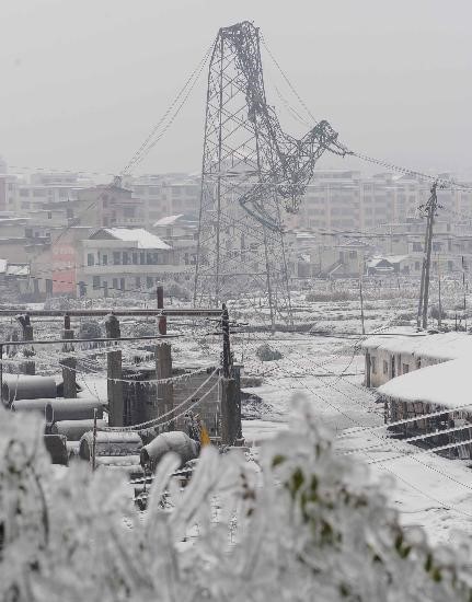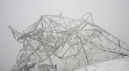 这是08年安徽大别山区的一处电力铁塔,由于突降大雪,气温骤然下降,加上持续的冻雨,输电线路出现了大面积的覆冰现象,不少塔位段覆冰严重,一些地段的覆冰厚度达到30-40mm,严重的甚至高达60-70mm,远超线路的设计标准,终导致多处电力铁塔倒塌,造成了巨大的经济损失。
