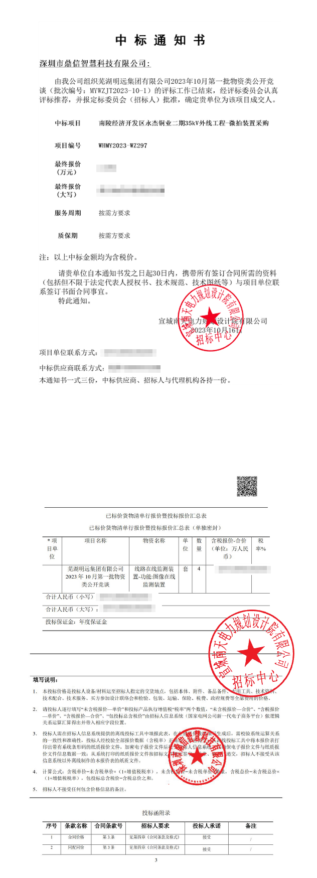 2023年10月26日,深圳市鼎信智慧科技有限公司在这次物资类公开招标采购中,成功中标芜湖明远集团有限公司物资供应处采购主设备外线工程-微拍装置 招标编号(WHMY2023-wZ297)佳绩频传。