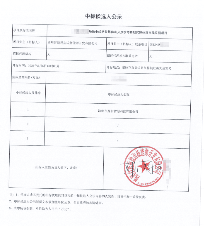 2024年05月06日,深圳市鼎信智慧科技有限公司在这次物资类公开招标采购中,成功中标海四川省能投盐边新能源开发有限公司采购主设备输电线路铁塔防山火装置 佳绩频传。
