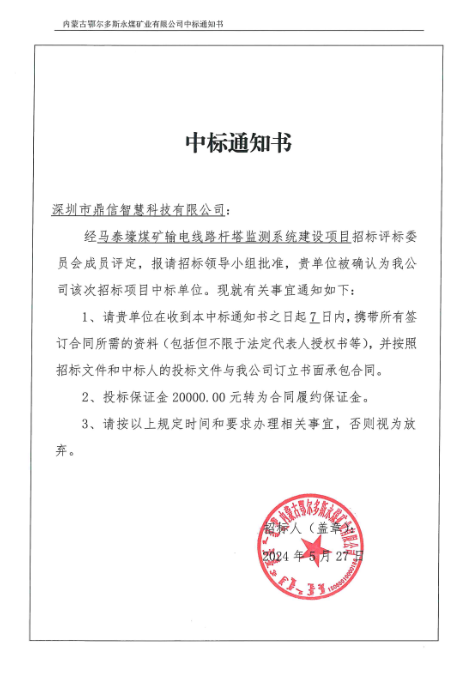 2024年05月27日,深圳市鼎信智慧科技有限公司在这次物资类公开招标采购中,成功中标马泰壕煤矿输电线路杆塔监测系统建设项目 佳绩频传。