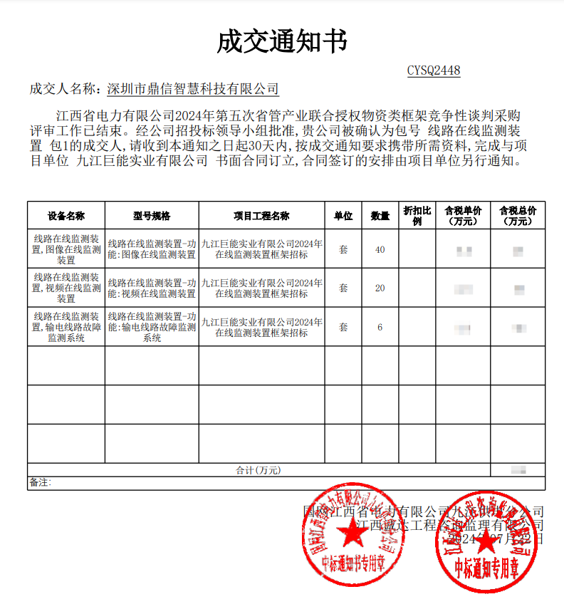 2024年08月05日,深圳市鼎信智慧科技有限公司在这次物资类公开招标采购中,成功中标江西省电力有限公司采购主设备线路在线监测装置、视频在线监测装置 (招标编号:CYSQ2448)佳绩频传。