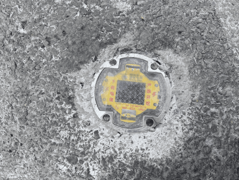 智能地钉外观为圆柱,采用嵌入式安装方式,简单便捷,安装后与地面保持齐平。整体使用铸铝工艺,显示面采用透明材质,具有电力标识、紧急联系方式、电缆或光纤指导方向。指示灯可见度白天大概20米,夜间100米左右。