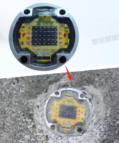 鼎信智能地钉DX-DLS100-B2,外形为小圆柱体,带反光,夜间起到提示作用;此外,其透明的高强度玻璃覆面下,是一块高效的光伏面板佐以电供电(结合电池);安装时,将智能地钉嵌入到已埋有电缆线路上方的路面中。