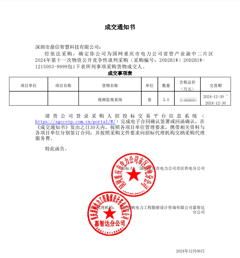 2024年12月06日,深圳市鼎信智慧科技有限公司在这次物资类公开招标采购中,成功中标为国网重庆市电力公司省管产业渝中二片区采购公开竞争性谈判采购主设备视频监视系统(采购编号: 20D2B1W)20D2B1W1215003-9999包1 佳绩频传。